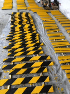 _ Chủ đầu tư yêu cầu loại tấm ốp cho hệ thông cầu thang sắt ngoài trời xung quanh nhà máy, tấm chống trượt có kích thước bản 70x30mm dài 500mm, phủ hạt chống trượt đặt biệt có độ kháng mài mòn cao.