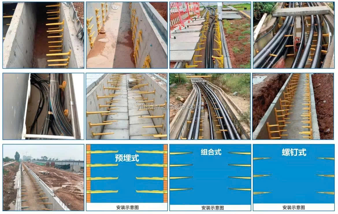 Bảo vệ cáp:Giá đỡ cáp ngầm FRP giúp nâng cáp lên cao, tránh tiếp xúc trực tiếp với mặt sàn hoặc các bề mặt khác, giảm nguy cơ hư hỏng do va đập, ma sát, hoặc các yếu tố môi trường như độ ẩm, hóa chất.