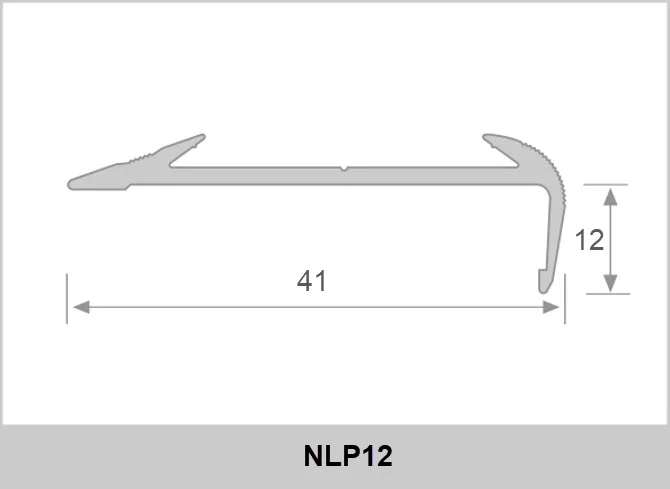 Nẹp chống trượt cầu thang NLP12, còn được gọi với các tên gọi là nẹp nhôm chống trơn chân 12 ly, nẹp mũi bậc 12mm, nẹp nhôm mũi bậc chân 12 ly, nẹp chống trơn cho bậc cầu thang lát gạch, nẹp nhôm chống trơn cho bậc cầu thang gỗ, nẹp chống trơn cho mũi bậc không có lợi.