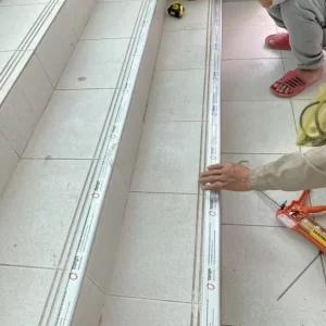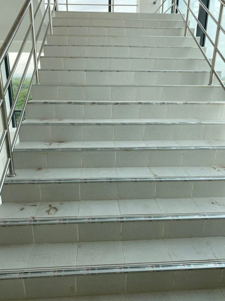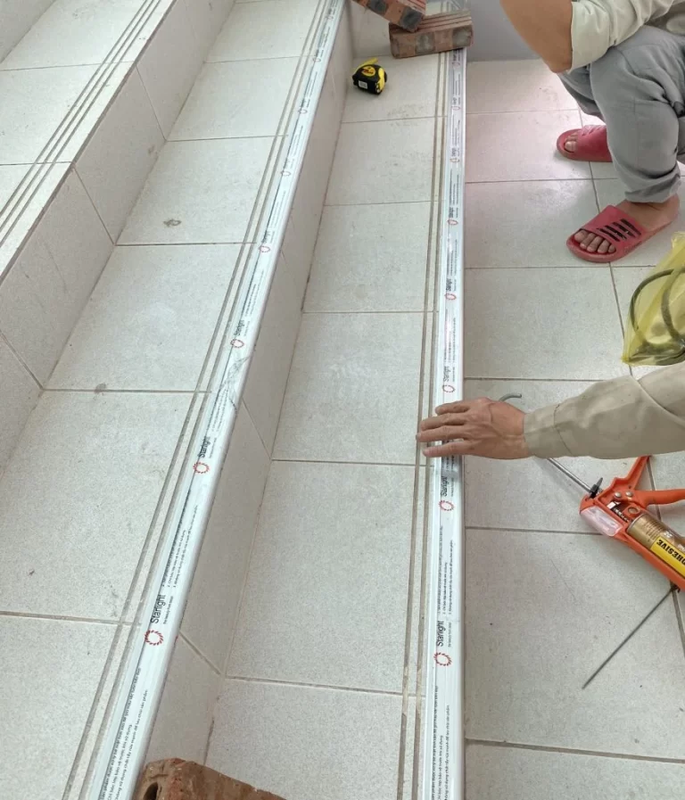 Một số hình ảnh công trình thi công sử dụng nẹp nhôm chống trơn gắn mũi bậc cầu thang NLP12 màu nhôm bạc: